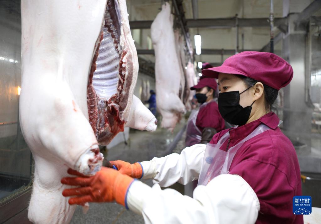 4月22日,工人在遼寧省臺安縣一家食品有限公司肉類加工流水線上工作。新華社記者 姚劍鋒 攝