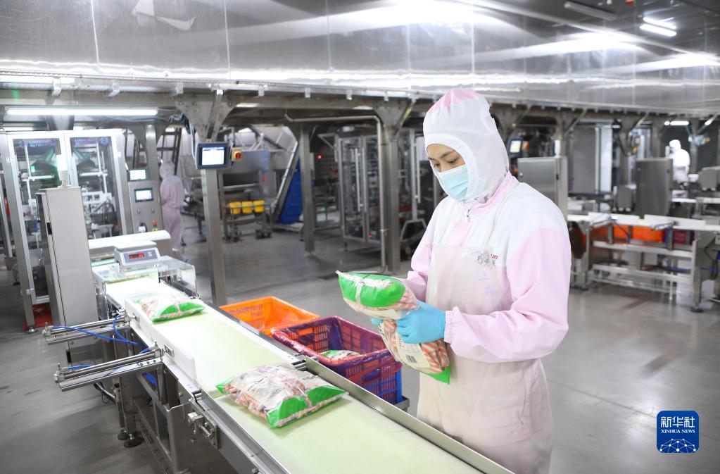 4月21日,工人在遼寧省臺安縣一家食品有限公司生產線上檢查食品包裝。新華社記者 王乙杰 攝