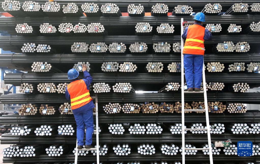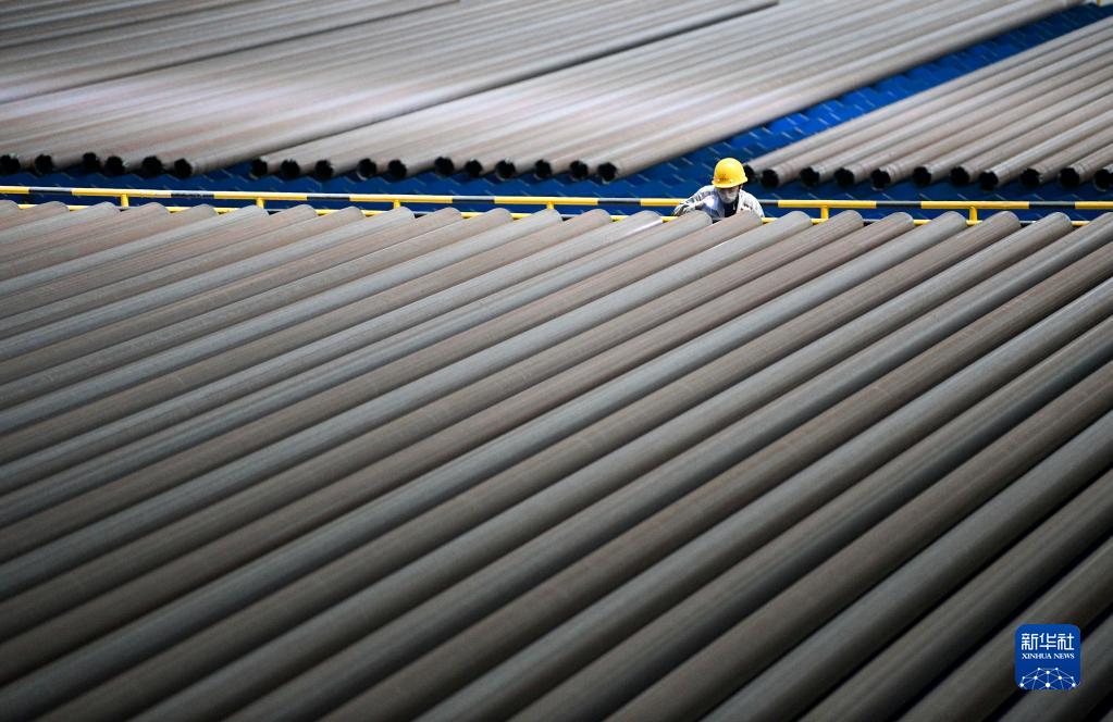 2022年4月19日,在位于承德市營子區的承德建龍特殊鋼有限公司無縫鋼管廠,工人檢查無縫鋼管品質。新華社發(王立群 攝)