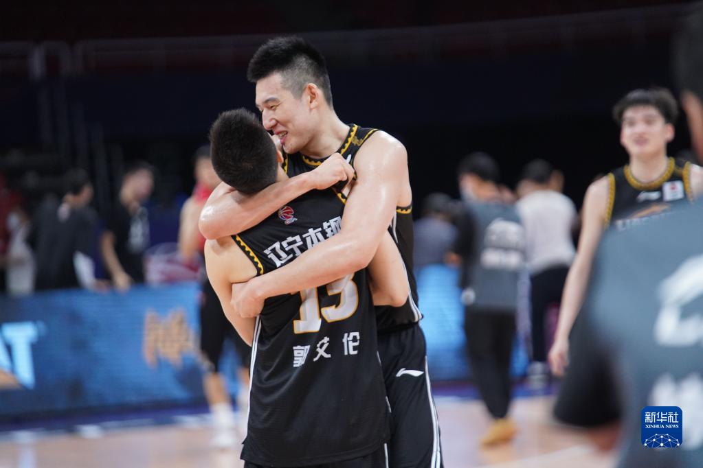 4月26日,遼寧本鋼隊球員郭艾倫(前)、付豪(后)在獲勝后擁抱。新華社記者 周密 攝