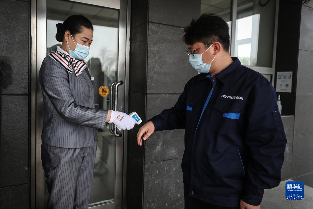 4月28日,工作人員對進入新松機器人自動化股份有限公司的員工進行測溫。新華社記者 潘昱龍 攝