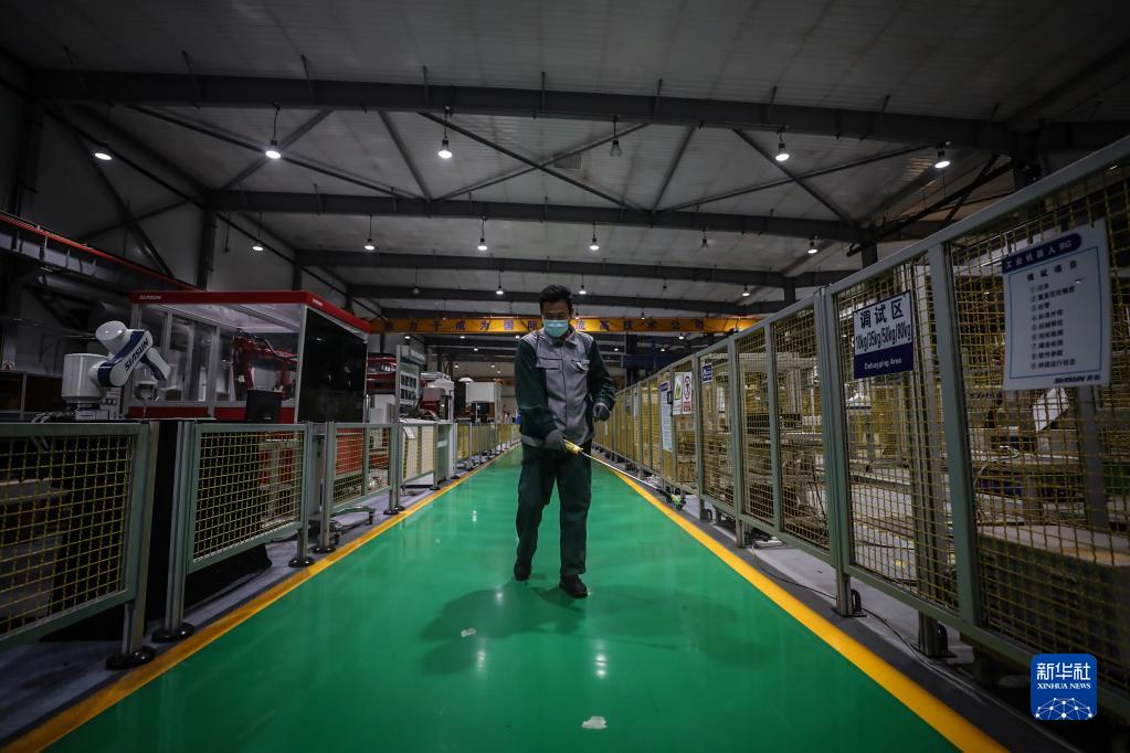 4月28日,工作人員在新松機器人自動化股份有限公司生產車間進行消殺工作。新華社記者 潘昱龍 攝