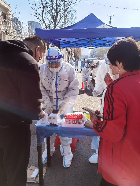 中興商業志愿者幫助前來參與核酸檢測的市民掃碼登記。照片由受訪者提供。