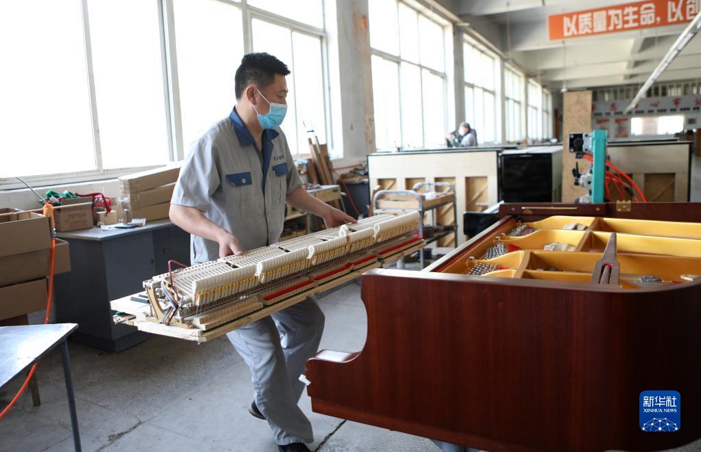 4月26日,劉玉磊在車間內將鋼琴鍵盤安裝到琴體上。新華社記者 王乙杰 攝