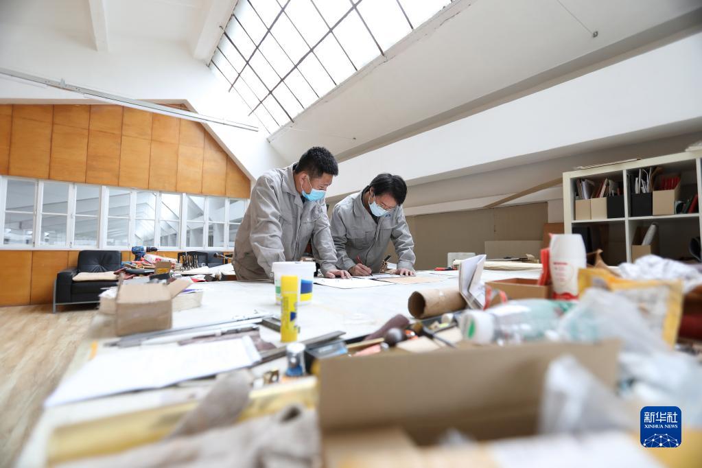 4月28日,劉玉磊和他的師父郭凱(右)在產品設計室內研究鋼琴裝配問題。新華社記者 姚劍鋒 攝