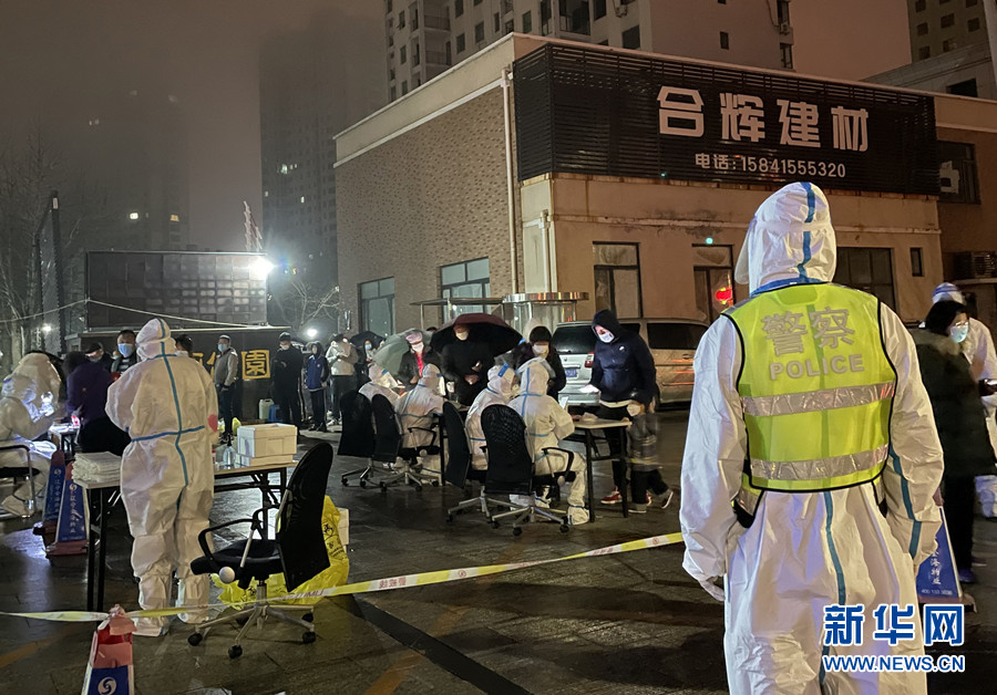 圖為丹東邊境管理支隊國門灣邊境派出所民警夜晚在小區核酸檢測點值守。新華網發