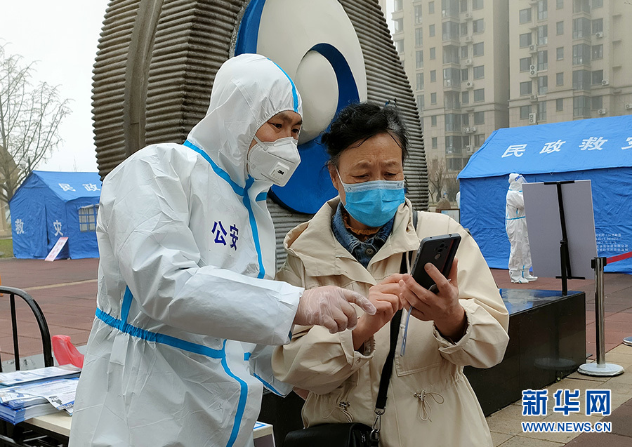 圖為丹東邊境管理支隊鴨綠江邊境派出所民警在核酸檢測點幫助群眾解答疑問。新華網發