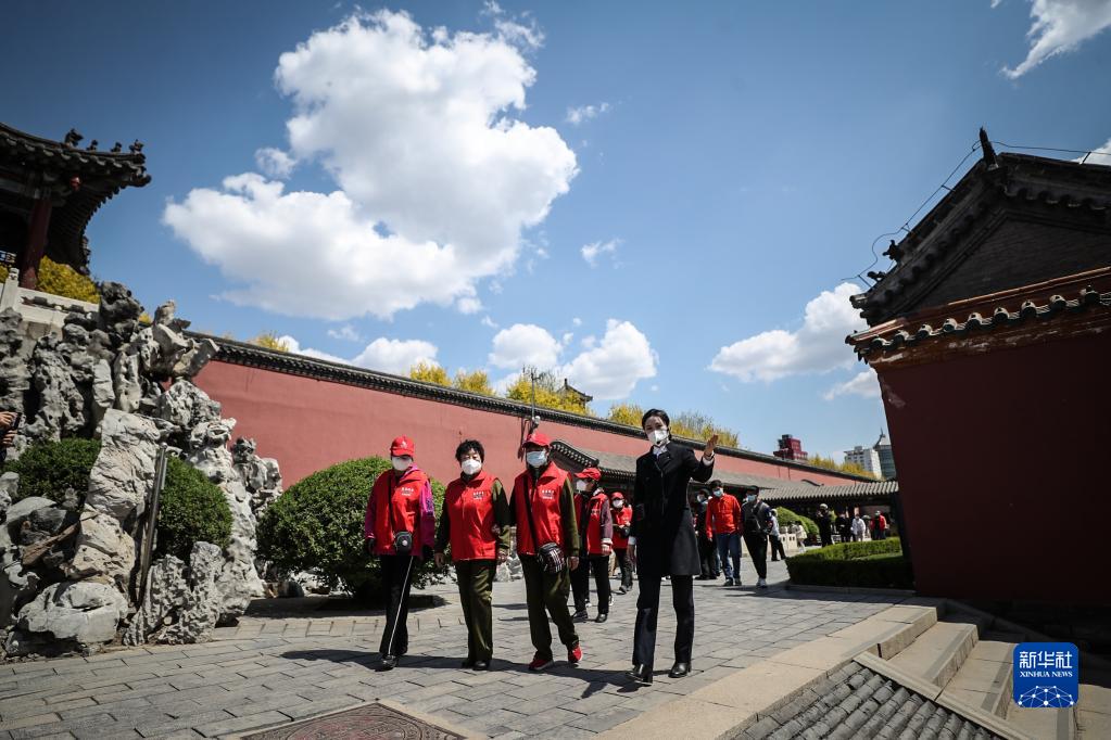 5月1日,曾奮戰在社區防疫一線的志愿者在講解員的引導下參觀沈陽故宮博物院。