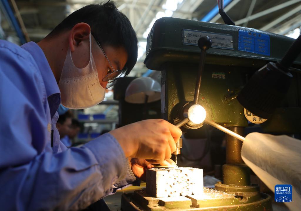 在沈陽飛機工業(集團)有限公司標準件中心,青年工人王明博在加工飛機零部件(4月19日攝)。新華社記者 楊青攝