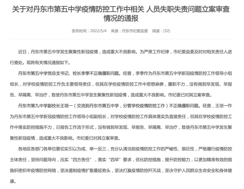 丹東市第五中學黨總支書記、校長李季作為丹東市第五中學新冠疫情防控工作領導小組組長,對學校疫情防控工作負主要領導責任,但其在學校疫情防控工作中思想麻痹,履職不力,沒有做到早發現、早報告、早隔離、早治療,致使丹東市第五中學發生聚集性新冠疫情,造成重大不良影響。丹東市紀委已對其立案審查。同時被立案審查的還有分管學校疫情防控工作的副校長王培一。(記者李錚、張逸飛)