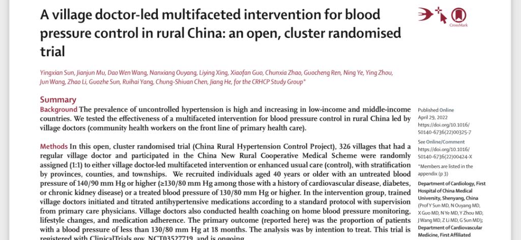 新華網沈陽5月7日電(記者張逸飛)近期,中國醫科大學附屬第一醫院心血管內科孫英賢教授團隊的中國農村地區高血壓綜合管理創新模式及強化降壓的大型整群隨機對照研究“中國農村高血壓控制項目(CRHCP)”的Ⅰ期結果——“村醫主導的高血壓綜合干預模式可顯著提高中國農村高血壓控制率”取得突破,4月30日在線發表于國際著名醫學雜志《柳葉刀》(The Lancet)雜志上。