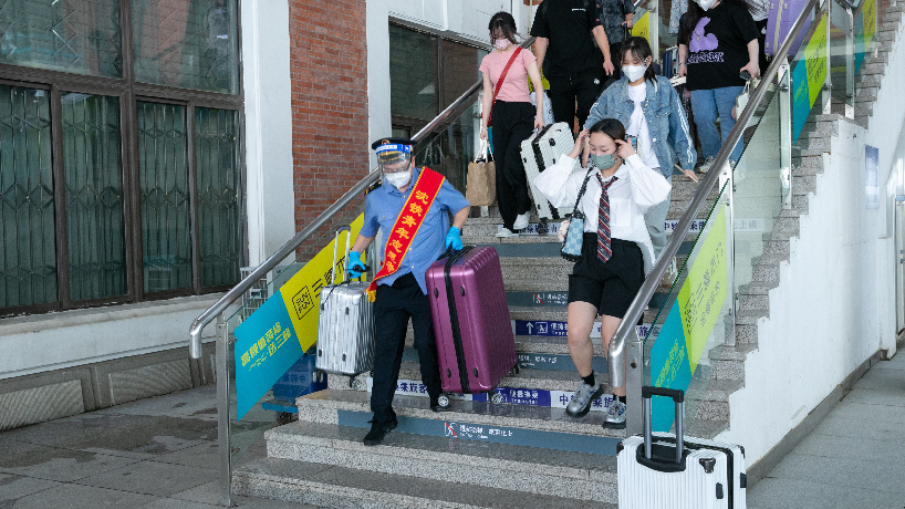新華網沈陽6月2日電(唐曉瑭)6月1日13時11分,217名在沈求學的大學生從沈陽站乘坐沈陽至大連G8054次列車,安全踏上返鄉之旅。