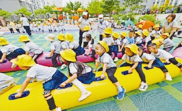 圖為本溪市北大青鳥幼兒園正在組織開展戶外趣味運動項目,激發孩子們的團結協作精神。