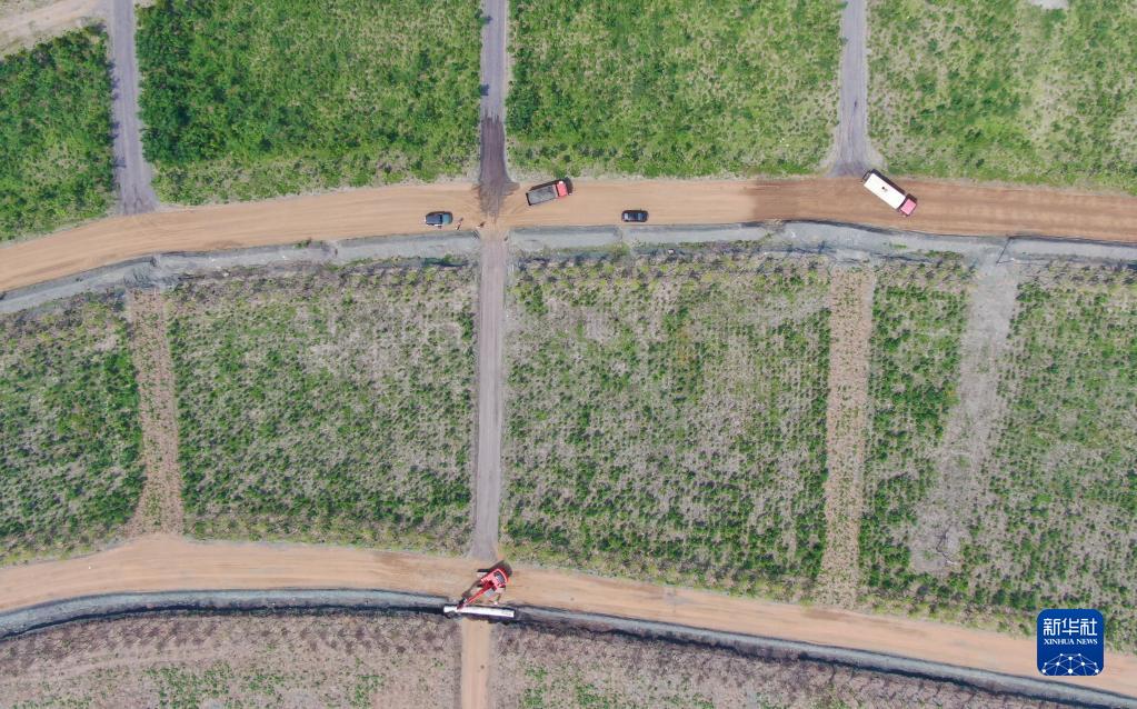 6月2日,工程車輛進行綠化作業(無人機照片)。新華社記者 楊青攝