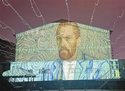 戶外墻體上投出了梵高自畫像。 李浩攝