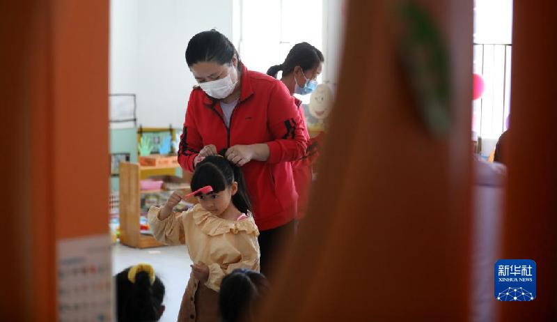 6月1日,牟蘋麗在幼兒園為一名小朋友梳頭。新華社記者 姚劍鋒 攝