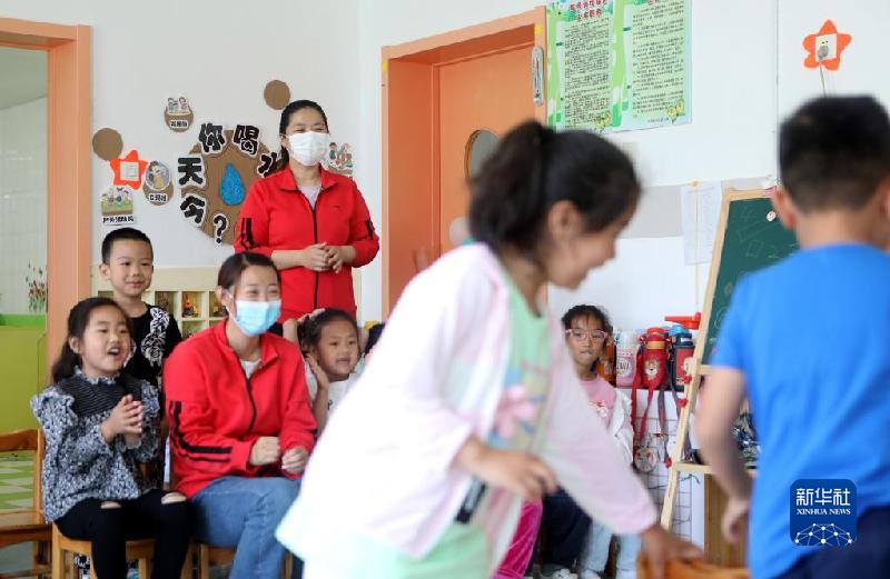 6月1日,牟蘋麗(后站立者)在班級里看小朋友們玩游戲。新華社記者 王乙杰 攝