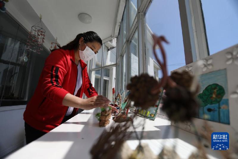 6月1日,牟蘋麗在幼兒園手工室里整理小朋友的手工作品。新華社記者 姚劍鋒 攝