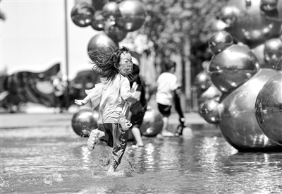 小朋友在鐵西區紅梅文創園戲水。 張文魁攝
