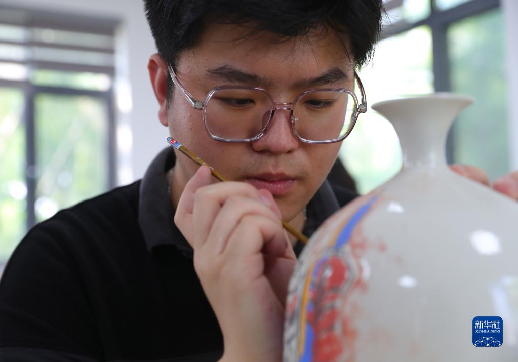 6月16日,在撫順大官窯陶瓷工作室,一位學生體驗陶瓷繪畫。新華社記者 楊青 攝
