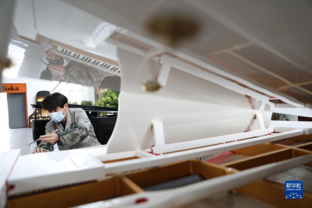 4月25日,一名工人在東北鋼琴樂器有限公司車間內組裝調校鋼琴組件。新華社記者 姚劍鋒 攝