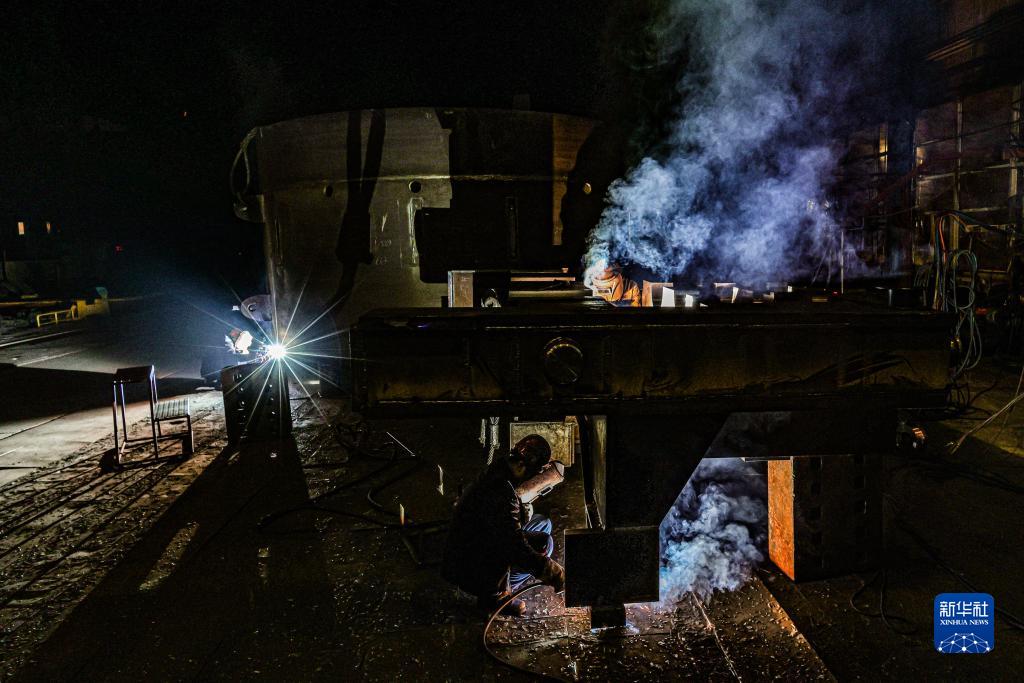 在沈陽北方重工集團有限公司,工人在車間焊接產品(2022年3月24日攝)。新華社發