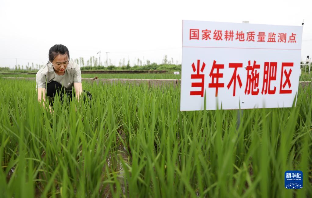 6月23日,高月在富家鎮四臺子村黑土地質量監測點查看水稻分蘗情況。新華社記者 姚劍鋒 攝