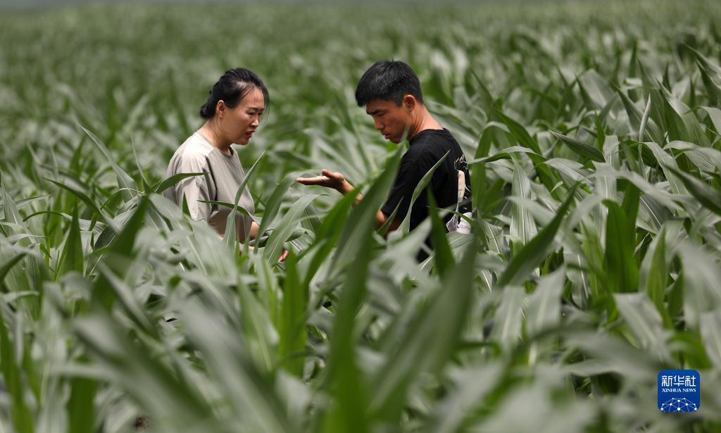 6月23日,高月(左)和同事在達牛鎮茨于村黑土地質量監測點觀察玉米生蟲情況。新華社記者 姚劍鋒 攝
