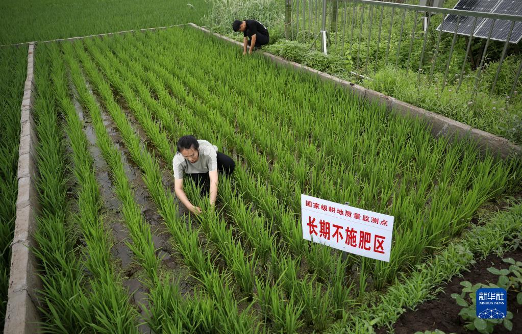6月23日,高月(左)和同事在富家鎮四臺子村黑土地質量監測點查看水稻分蘗情況。新華社記者 姚劍鋒 攝
