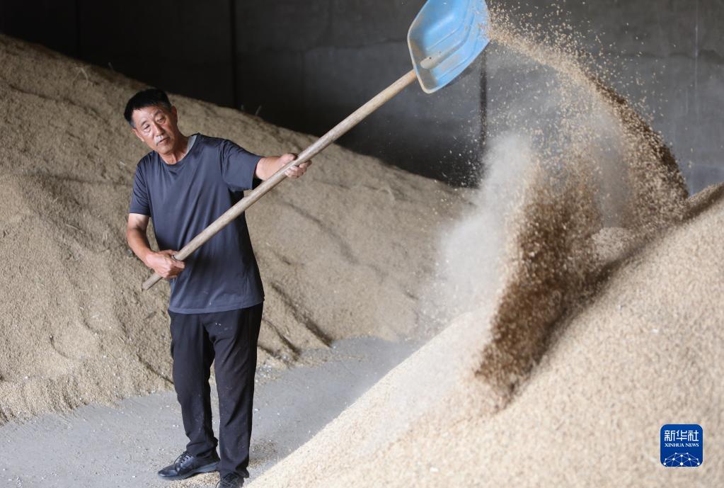 7月6日,于會懷在合作社糧倉內整理存糧。新華社記者王乙杰攝