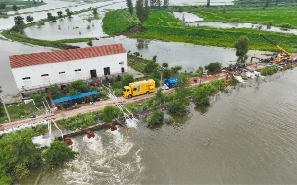 圖為受連日強降雨和上游來水影響,鐵嶺市鐵嶺縣雙井子鎮王河堤防出現險情,鐵嶺縣調集人力物力對河水進行強排,全面搶險排澇。