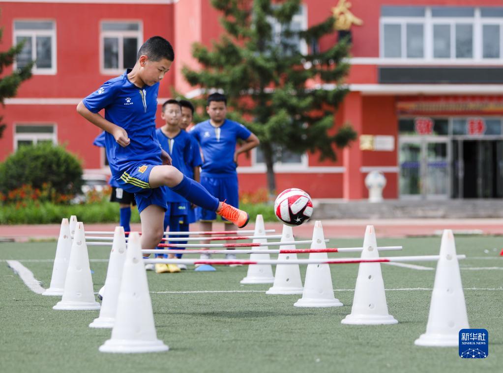 7月14日,在遼寧省沈陽市法庫縣臥牛石中心小學,男足隊員在訓練中。新華社記者 王乙杰 攝