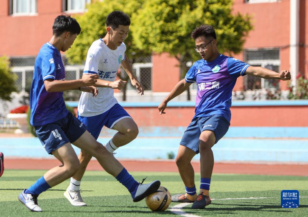 7月14日,在遼寧省沈陽市法庫縣第二高級中學,男足隊員在訓練賽中拼搶。新華社記者 王乙杰 攝