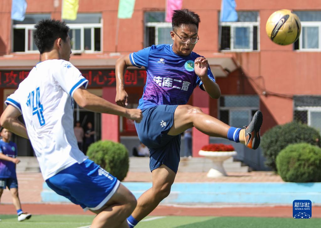 7月14日,在遼寧省沈陽市法庫縣第二高級中學,男足隊員在訓練賽中拼搶。新華社記者 王乙杰 攝