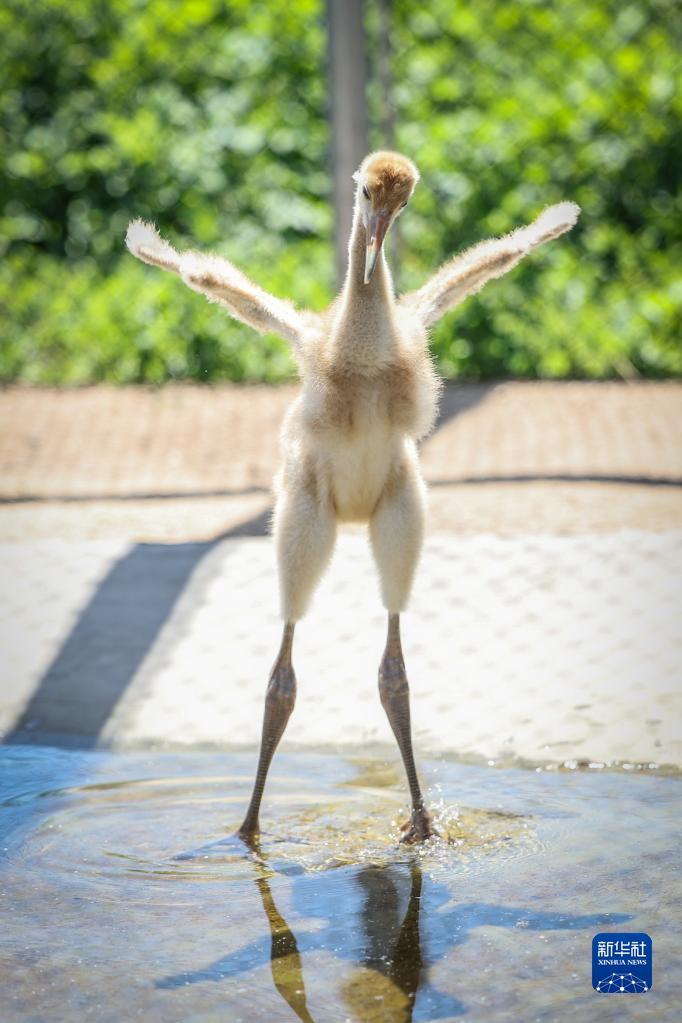 7月14日,一只丹頂鶴雛鳥在保護站內活動。新華社記者 潘昱龍 攝