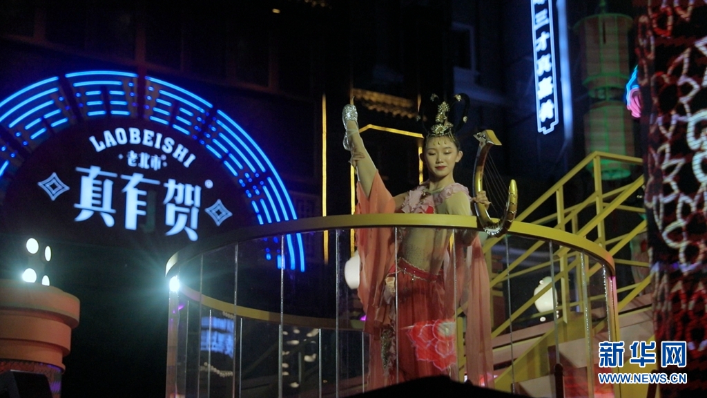北市場內,裝扮成“飛天”造型的舞蹈演員在花車上起舞。新華網 夏銘陽 攝