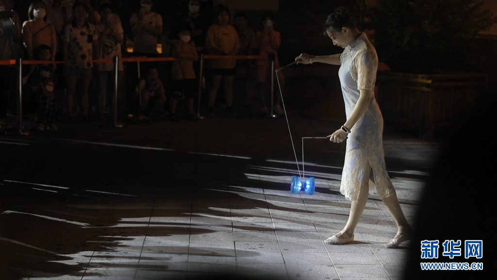 北市場內,身穿旗袍的演員表演“抖空竹”技藝。新華網 夏銘陽 攝