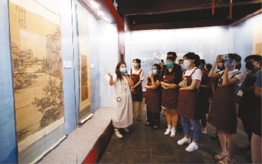 “你們看石濤的這幅畫,是立軸,裱件由三種顏色鑲料組成,是在兩色裱的基礎上,在隔水和天地頭中間再加副隔水?!痹谟H手完成鏡片裝裱后,體驗者們又走進師善齋、協中齋,沈陽故宮博物院保管部修復師馮維以“境由心生——沈陽故宮院藏明清文人書畫展”中展出書畫為例,深入淺出地為體驗者講解了古書畫裝裱修復的具體過程,帶領大家領略了中華書畫裝裱修復技藝的精巧絕妙之處。