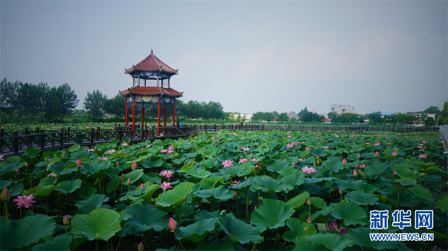 7月,沈陽市遼中區養士堡鎮養前村連心湖內荷花盛開。湖中蓮葉團團簇擁在一起,形成綠浪,粉色荷花點綴其間,十分美艷。新華網唐曉瑭攝