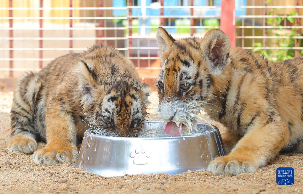 7月27日,兩只小老虎在吃奶。新華社記者 楊青 攝
