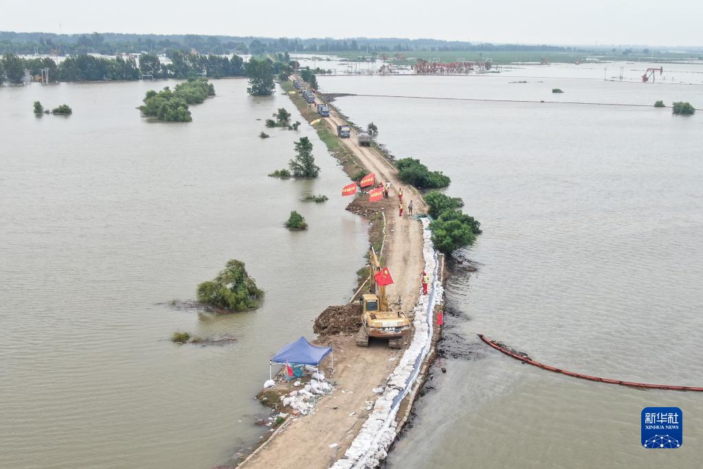 8月3日,參與搶險的工作人員在遼寧省盤錦市繞陽河左岸曙四聯段潰口附近作業(無人機照片)。新華社記者 潘昱龍 攝
