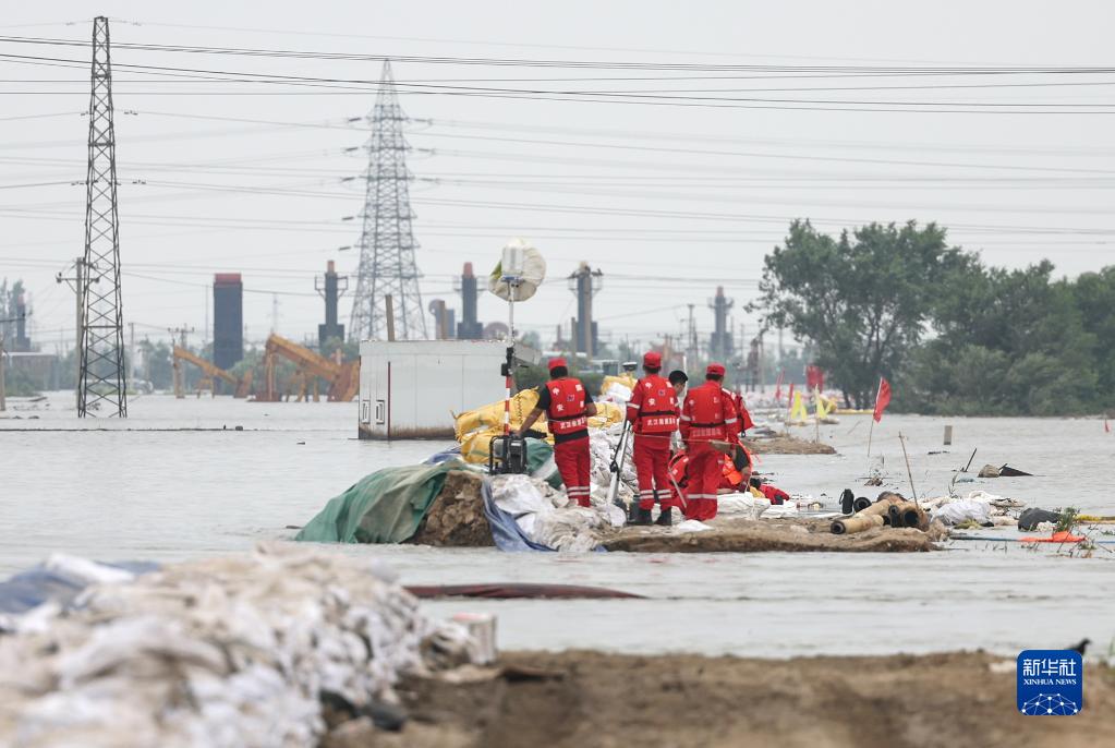8月3日,參與搶險的工作人員在遼寧省盤錦市繞陽河左岸曙四聯段潰口處監測險情。新華社記者 潘昱龍 攝