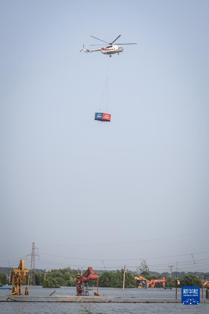 8月4日,直升機吊裝六角沉箱前往潰口處。新華社記者 潘昱龍 攝