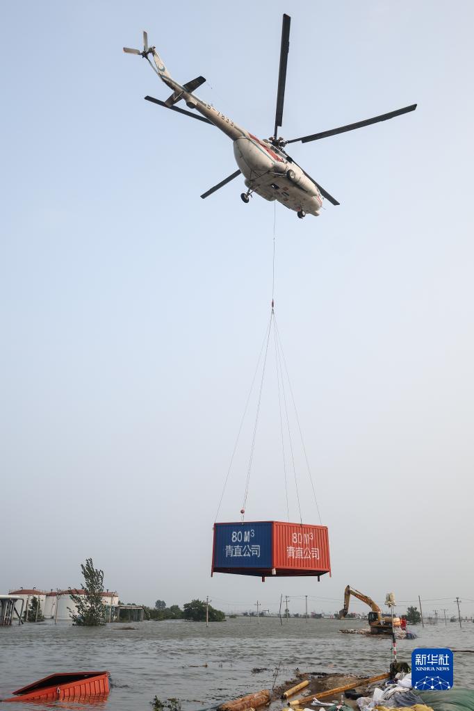 8月4日,直升機在潰口處投放六角沉箱。新華社記者 潘昱龍 攝
