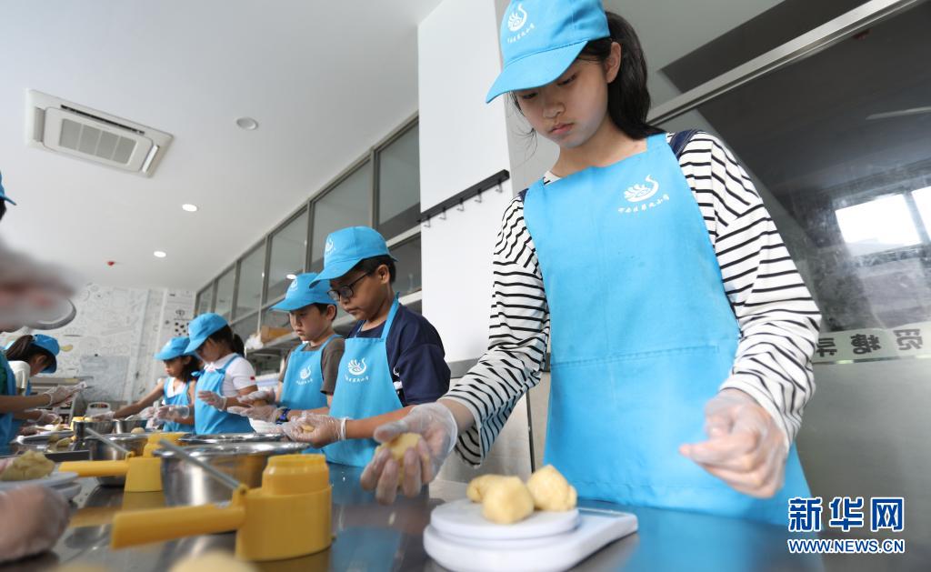 8月4日,在遼寧省沈陽市渾南區第九小學,參加暑期托管班的學生學習做月餅。新華社記者 王乙杰 攝