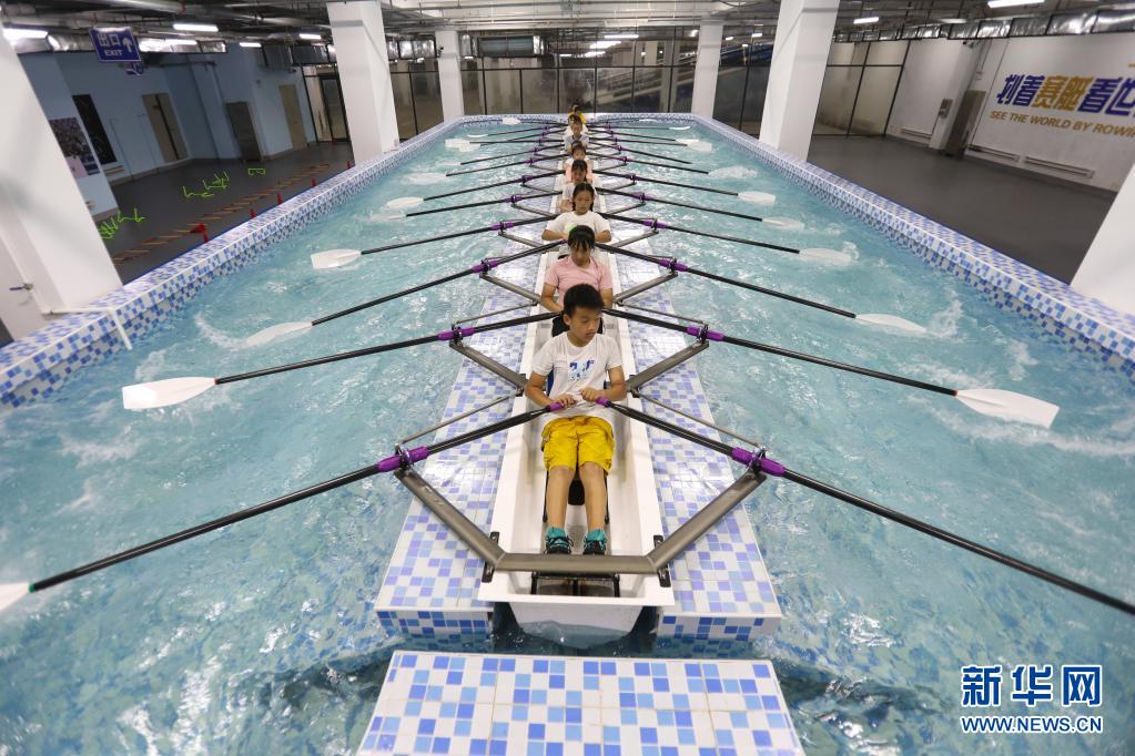 8月4日,在遼寧省沈陽市渾南區第九小學,參加暑期托管班的學生在賽艇池練習。新華社記者 王乙杰 攝