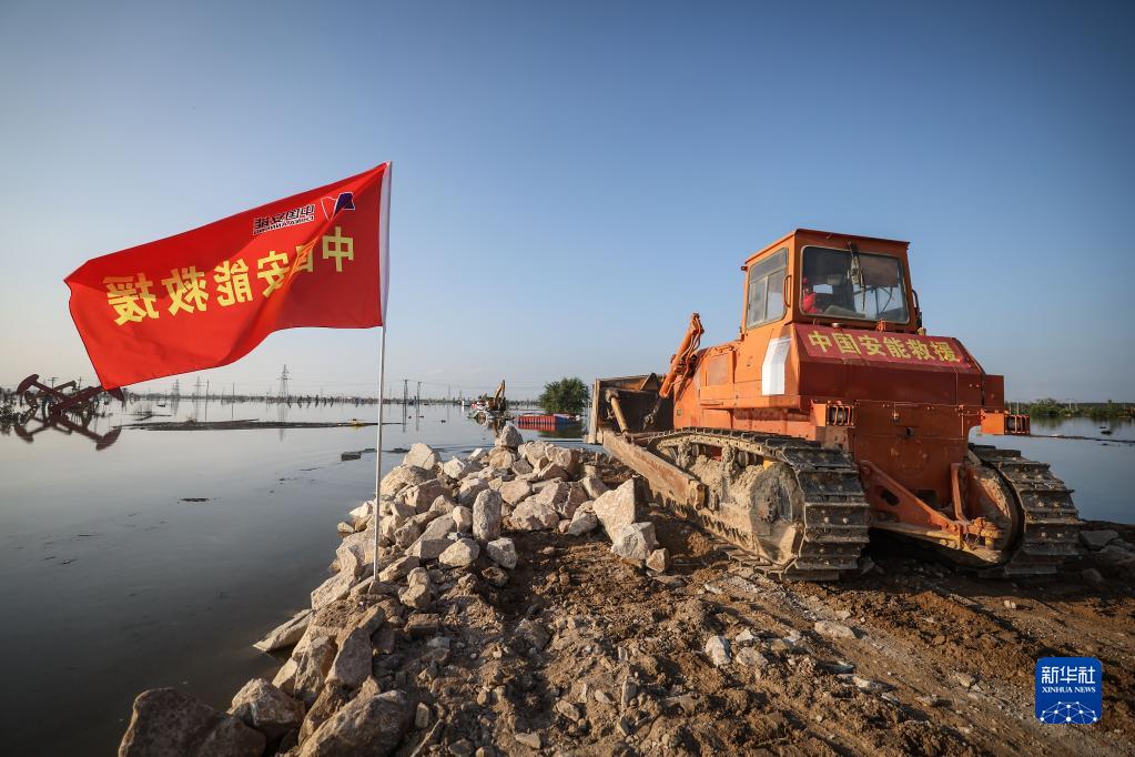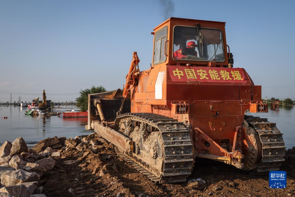 8月5日,中國安能集團搶險人員在潰口處駕駛推土機進行封堵作業。新華社記者 潘昱龍 攝