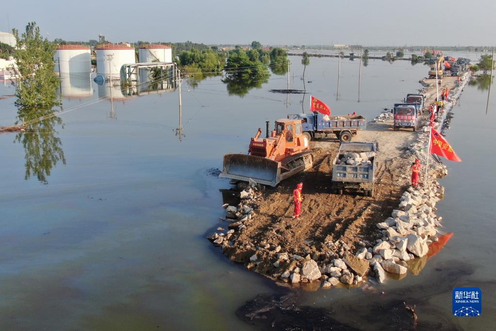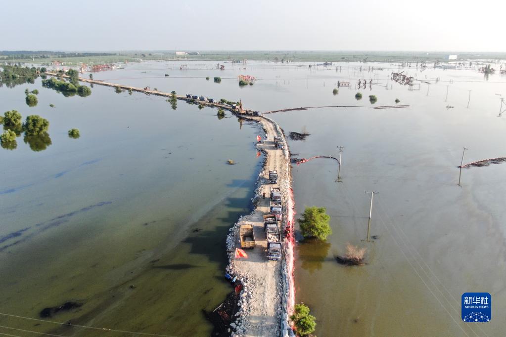 8月5日,搶險人員運送物料前往繞陽河潰口處(無人機照片)。新華社記者 潘昱龍 攝