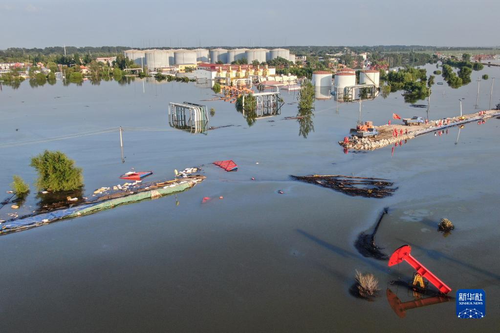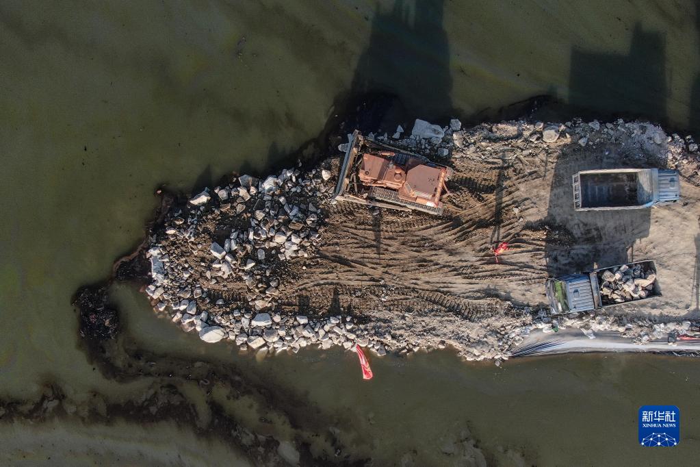 8月5日,中國安能集團搶險人員在潰口處駕駛推土機對潰口進行封堵作業(無人機照片)。新華社記者 潘昱龍 攝