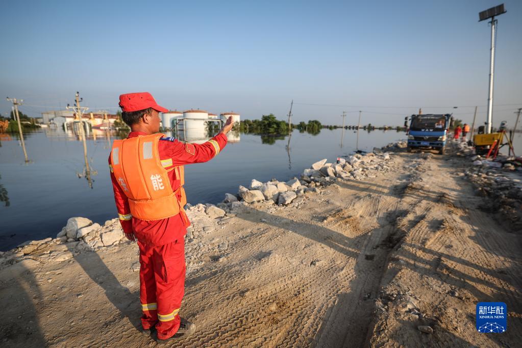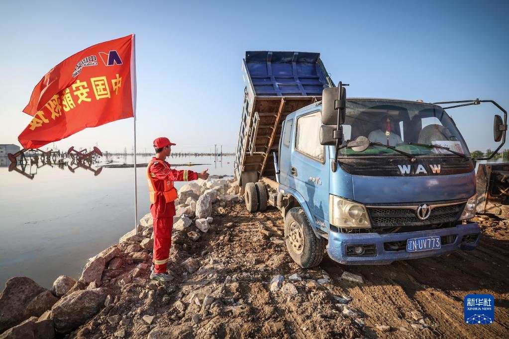 8月5日,中國安能集團搶險人員指揮運送搶險物料的車輛前往潰口進行封堵作業。新華社記者 潘昱龍 攝